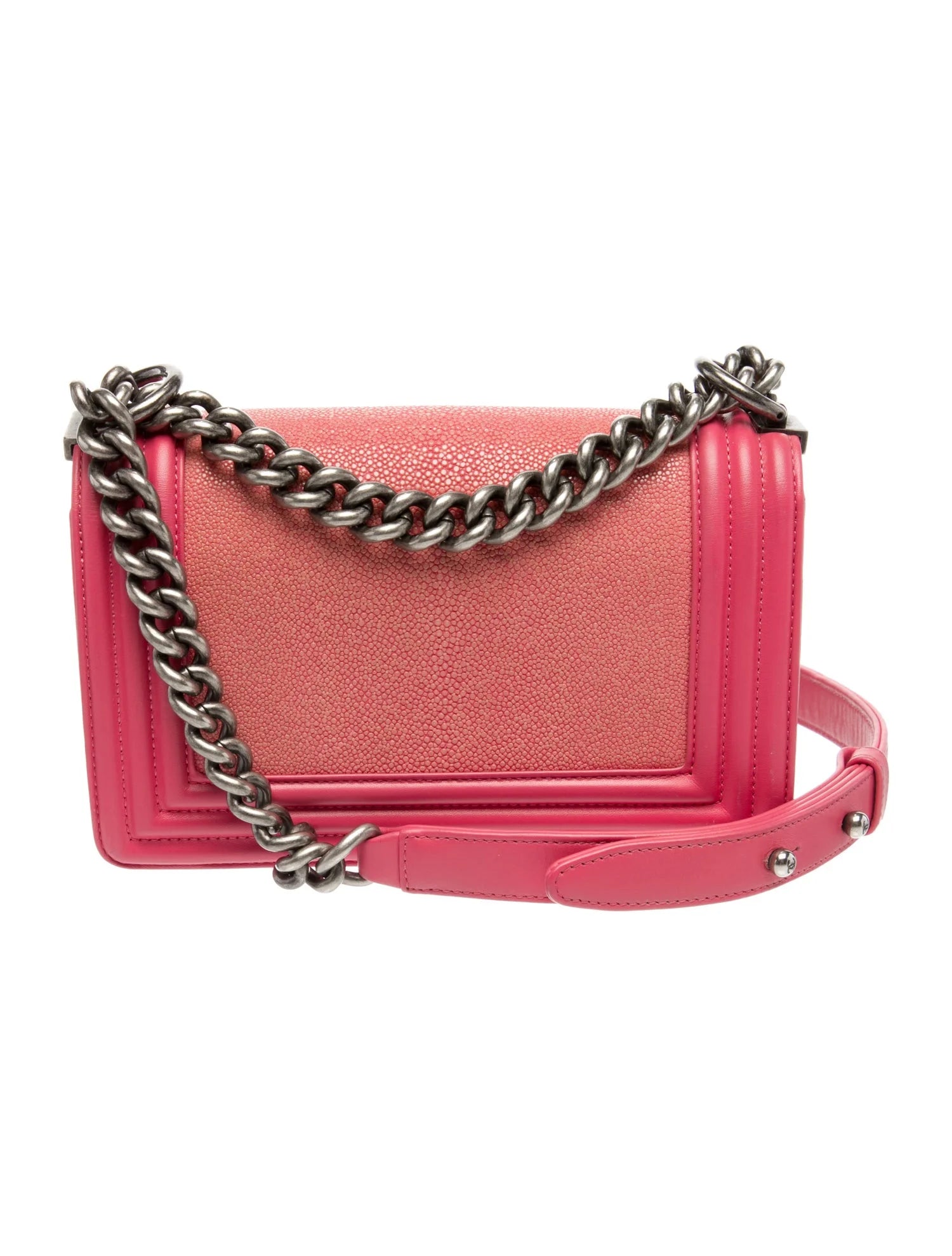 This highly coveted Boy Bag combines Chanel's modern, edgy silhouette with rare, luxurious materials. Crafted from vibrant pink leather and accented with a striking Galuchat (stingray) panel, this piece is an exceptional display of exotic craftsmanship.